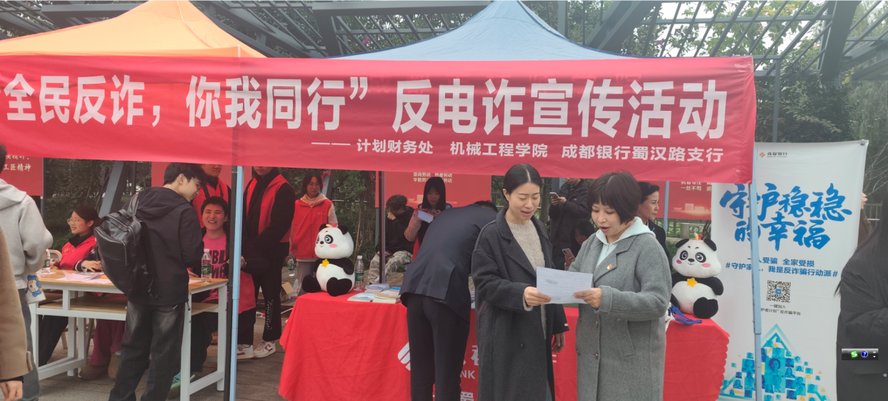 为切实防范电信网络诈骗风险,强化全校师生财务安全意识,全力保障师生合法权益与学校资金安全,11月5日至7日,计划财务与招投标管理处联合机械工程学院、成都银行,共同开展反电诈专项宣传活动。三方以专业合力筑牢反诈“防火墙”,推动校园反电诈工作走深走实,为平安校园建设注入坚实保障。